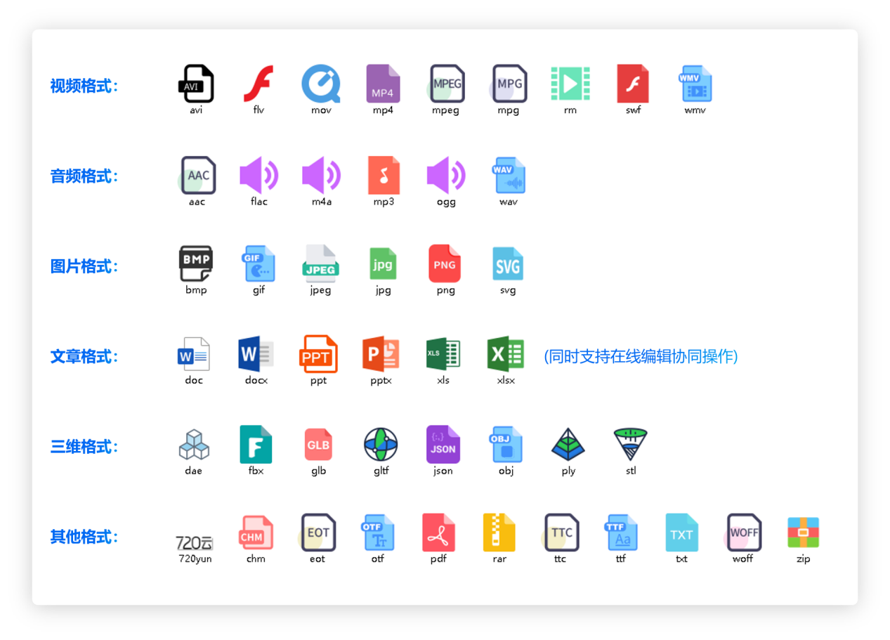 (1)全格式资源支持:常规资源,视频(转码为多清晰度,播放同步解析文本)、音频(语音识别转文字)、图片(OCR识别,文本与图片区域双向定位)、文档(关键词高亮与跳转);特色资源,3D文件(支持dae、fbx、glb、gltf、json、obj、ply、stl等几乎所有三维格式文件的旋转、缩放、拖拽、自定义背景)、中小学学习资源(课件、试卷、教案、PPT结构化、电子书管理)。