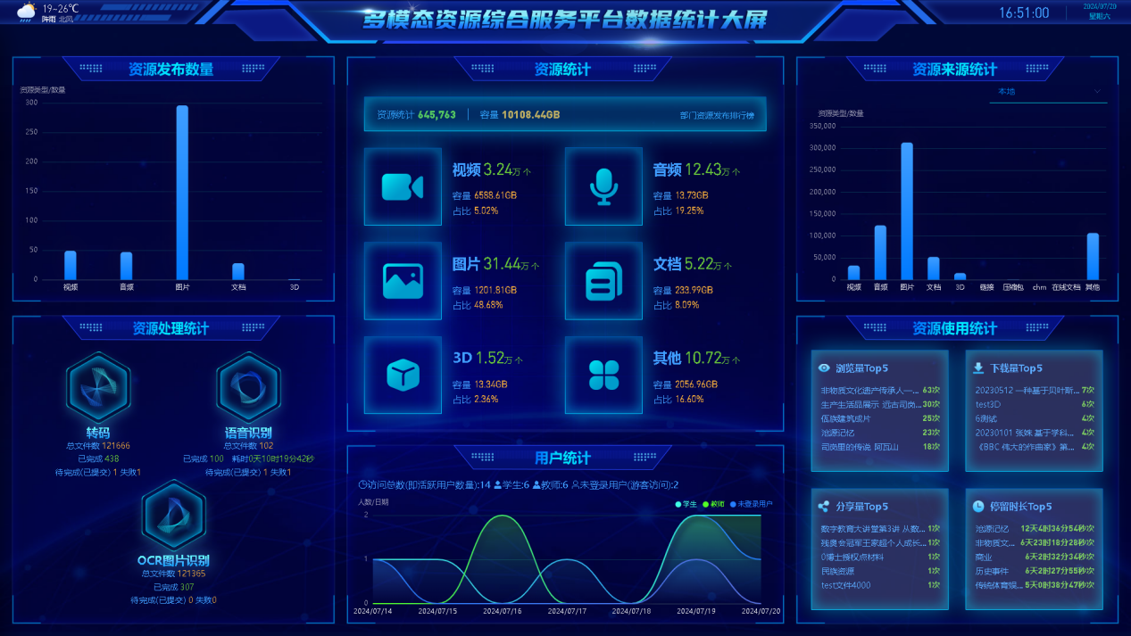 (1)可视化数据大屏:统计中心展示资源数据、用户访问数据,助力学校了解资源缺口、合理化配置存储硬件设备、为采购部门统计服务器存储预算提供数据支撑。