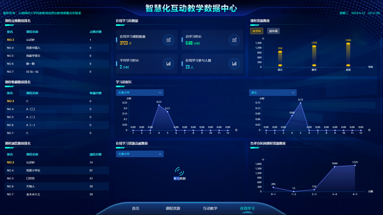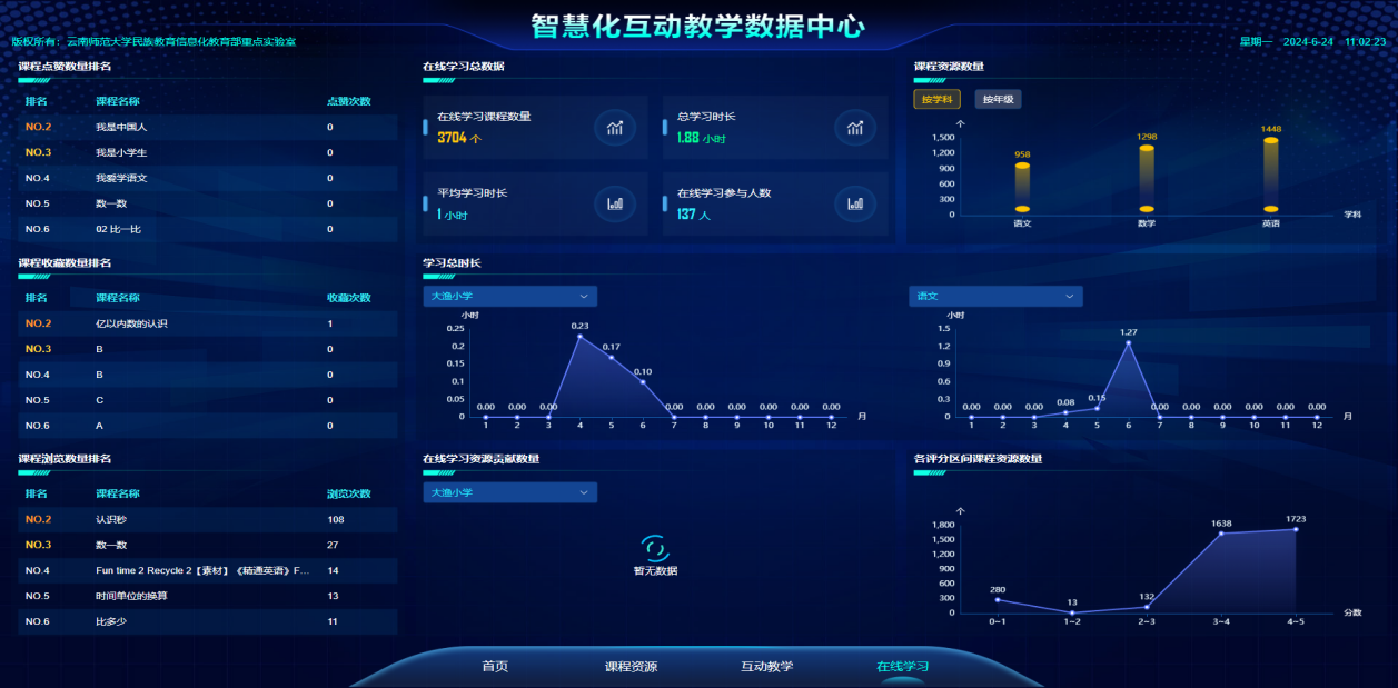 (3)在线学习数据分析:汇总在线学习的参与人数、学习时长、课程完成率及资源访问轨迹等数据,呈现学习整体态势。分析不同时段、不同课程的学习热度,为优化在线学习安排和资源推送提供数据支撑。