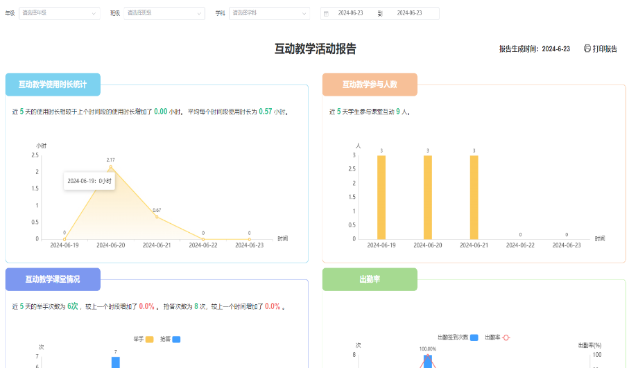 (2)教师报告分析:汇总教学活动中的互动数据、学生掌握程度等信息,剖析教学成效与待优化环节。提供教学策略调整建议,帮助教师总结教学经验,精准把握教学方向,提升课堂教学质量。