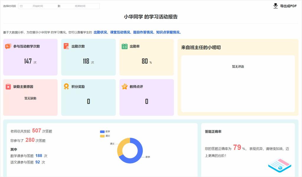 (1)学生家长报告:涵盖学生课堂表现、学业成果及进步轨迹,用直观图表呈现学习状态。同步学习短板与提升建议,让家长清晰掌握孩子学习情况,便于家校协同制定辅导计划,助力学生针对性改进。
