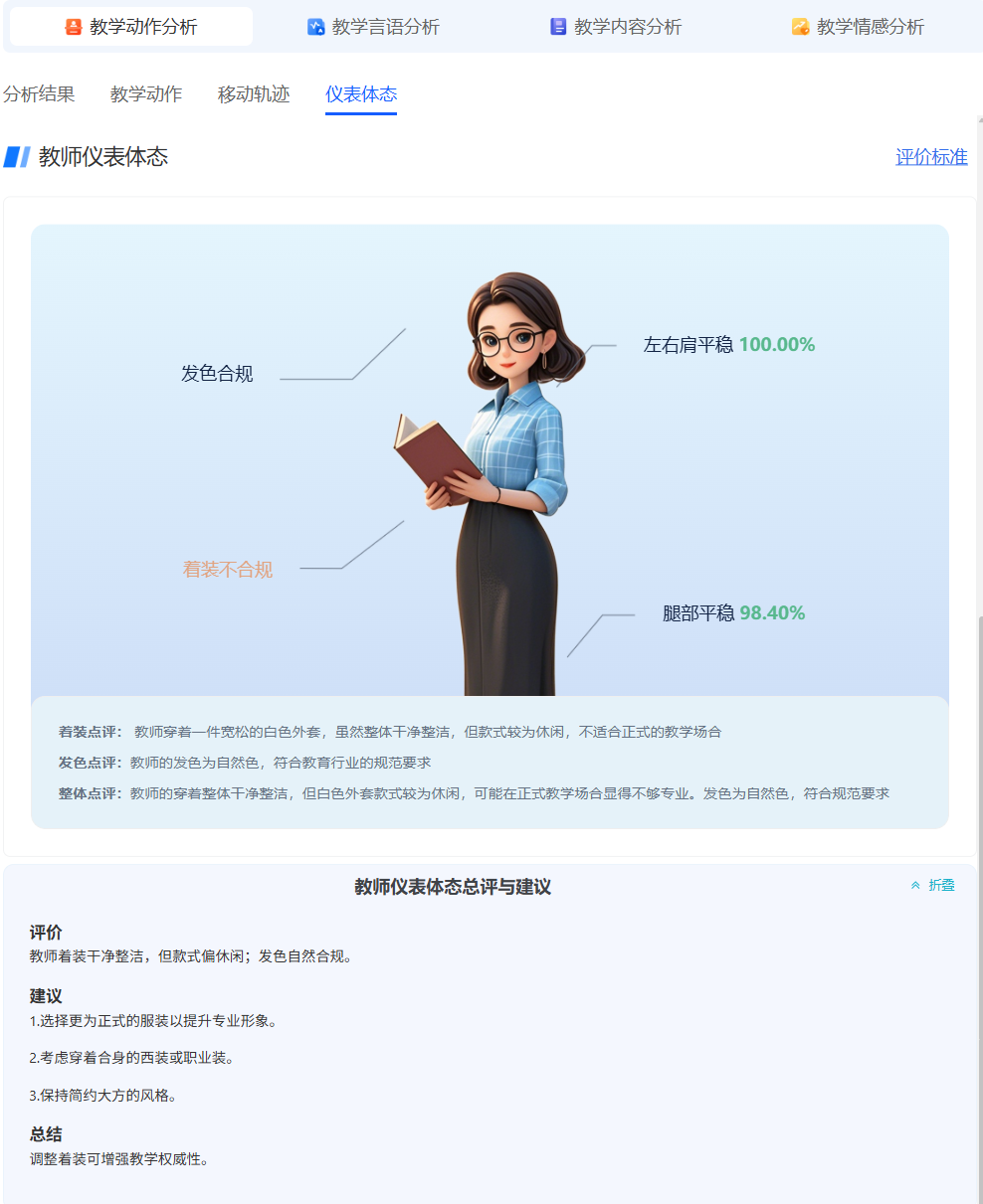 (4)教学内容分析。基于视频图像、文本理解、多模态大模型等AI技术,全面解析课堂讲授内容、讲授逻辑、板书设计、课件规范、教学设计合理性及大纲匹配度等深层次教学内容。