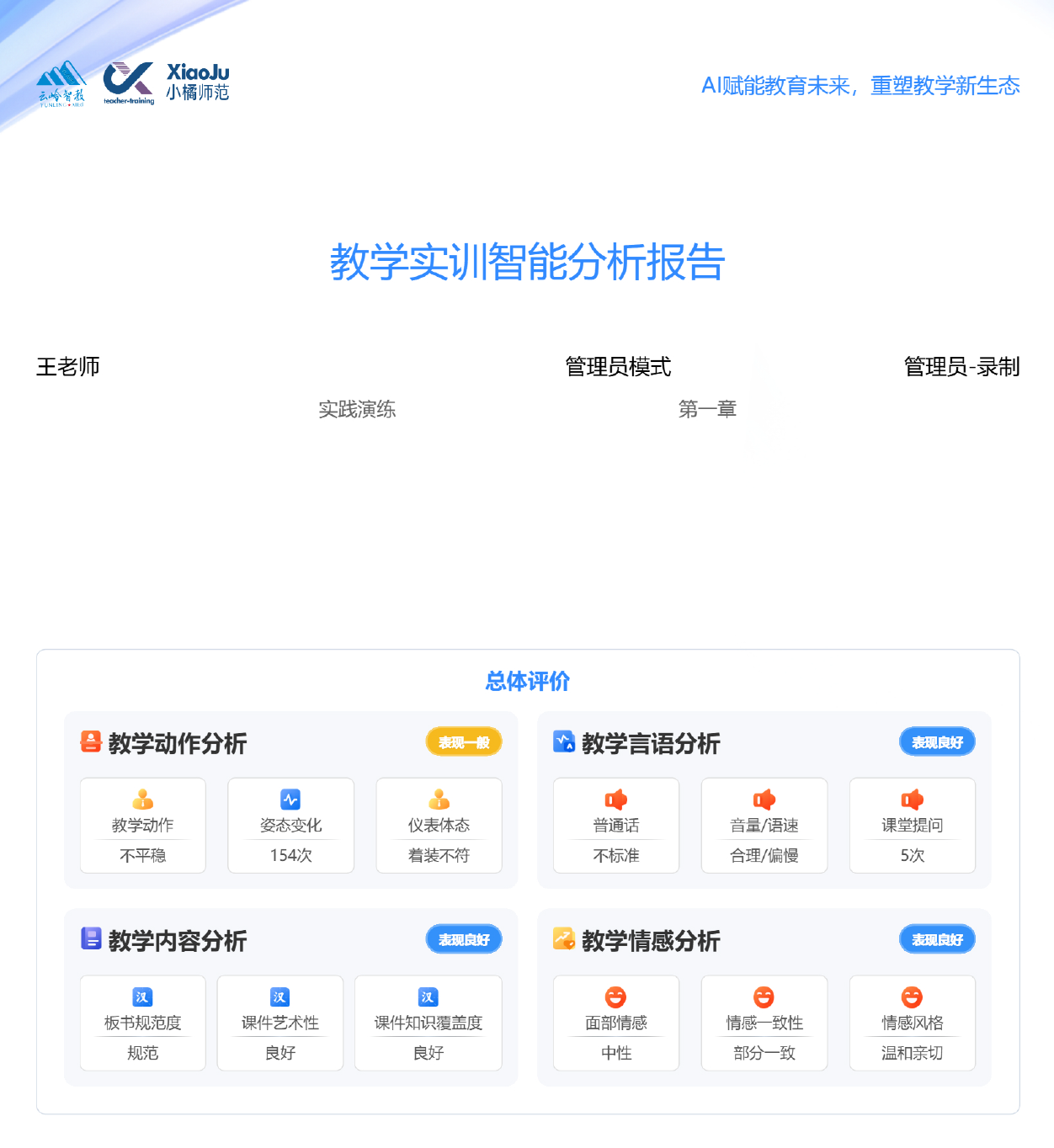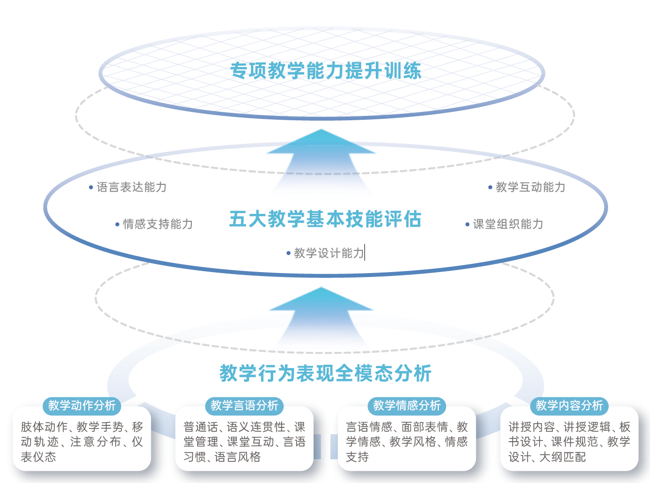 (3)系统性评估报告:综合师范生教学行为表现,从语言表达能力、情感支持能力、教学设计能力、教学实施能力、课堂组织能力等五大方面系统性评估师范生基本教学技能。