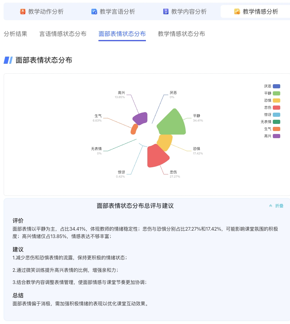 (2)教学言语分析。基于语音识别和文本理解AI技术,实时检测普通话表达、语义连贯性、课堂管理、课堂反馈、和语言风格等,深度解码课堂教学互动效果和知识传授密度。